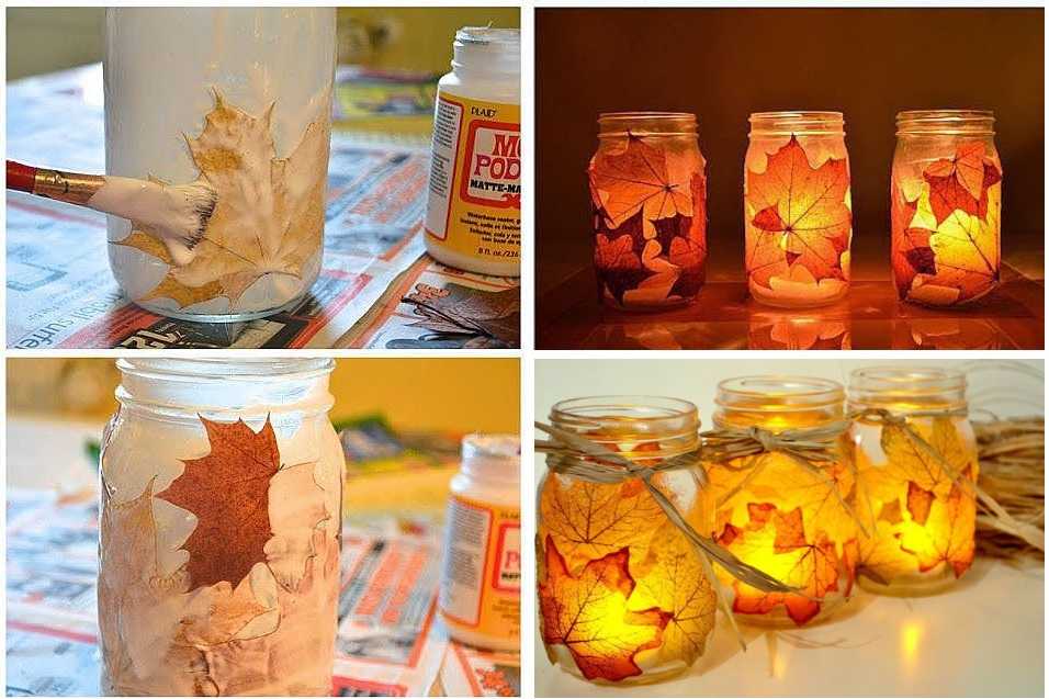 Подвески и гирлянды из листовых пластинок. Для изготовления понадобятся два-три листика, бесцветный лак, парафин, нитка либо лента. Осенние листочки покрывают лаком, а потом опускают в растопленный парафин. Их перетягивают нитками или красивыми лентами, делают петли и развешивают в нужном месте. Также на нитку или ленту можно нанизать бисер, что придаст изюминку этому аксессуару. Гирлянда – более сложный вариант декора. Чтобы ее изготовить, необходимо обработать листья в лаке и парафине, а потом закрепить листочки по одному на нитке либо ленте, оставляя небольшие промежутки.