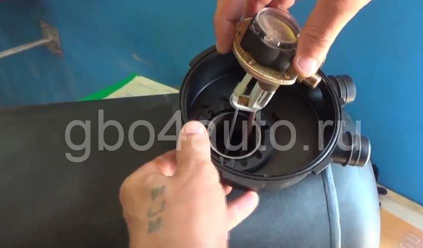 Устанавливаем «мультик» в баллон. После установки поплавок должен быть в максимально опущенном состоянии (касаться дна баллона), а датчик уровня газа на мультиклапане показывать «пустой бак».