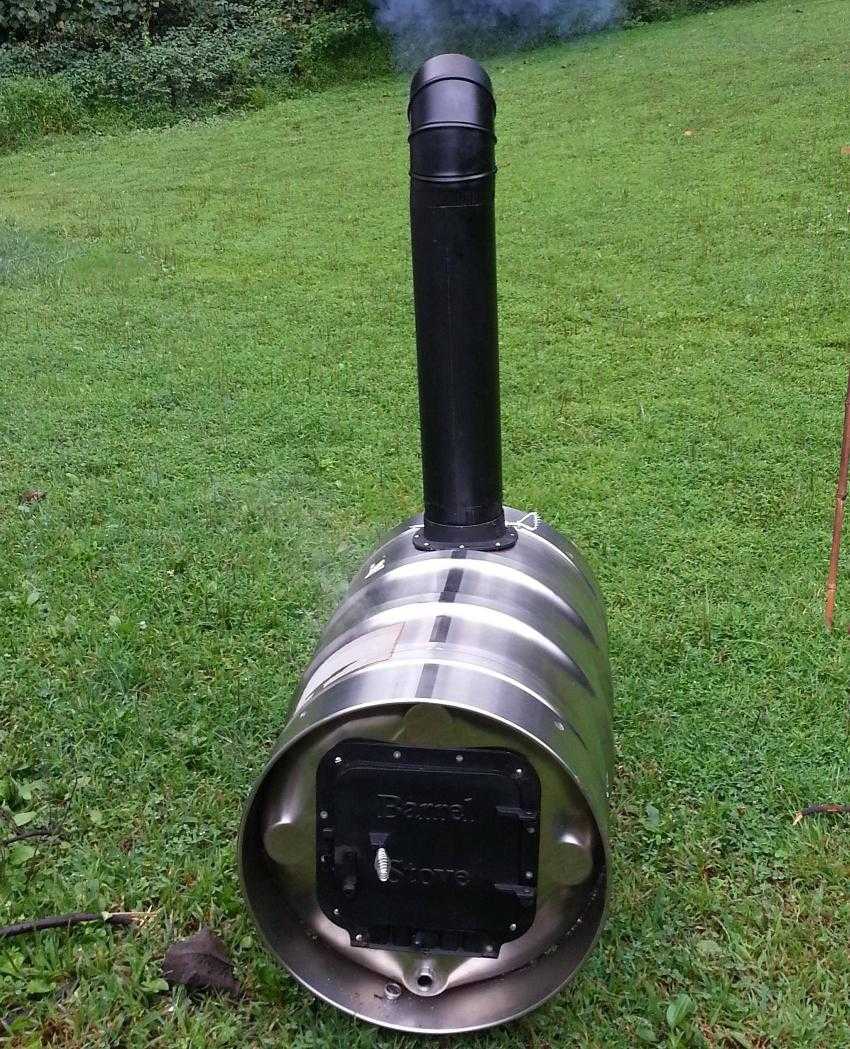 Самодельная печь буржуйка из бочки имеет высоту 89 см, диаметр 60 см и вес 21 — 25 кг, обладает глухим подом и достаточно высокой дымоотводной трубой. В качестве топлива используется древесные опилки, стружка, сухие дрова и топливные брикеты. Вследствие достаточно тонких металлических стенок и высоты корпуса КПД такой печи не превышает 15 — 20%.