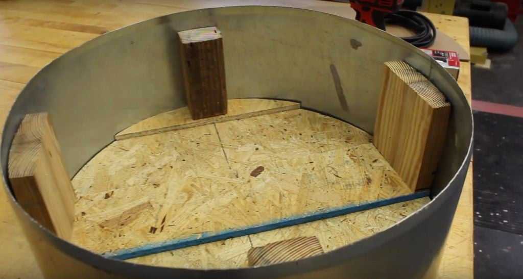 | Вкручиваем саморезы для укрепления колец. Далее выполняем вырезку отверстия с помощью лобзика в середине бочки. Снова отшлифовываем все неровности | |