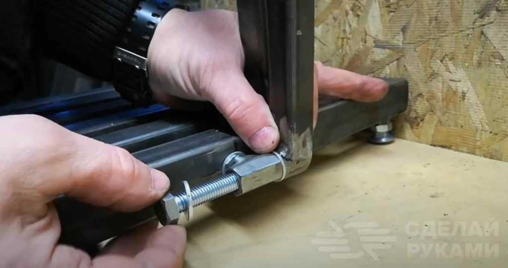 Для этого в стойке надо просверлить отверстие, в которое вставляется болт (изнутри профиля). На него накручивается удлиненная гайка. Зачищаем сварные швы и красим все элементы конструкции.