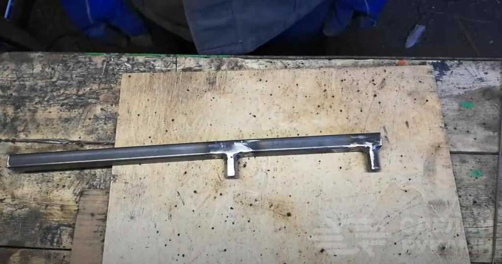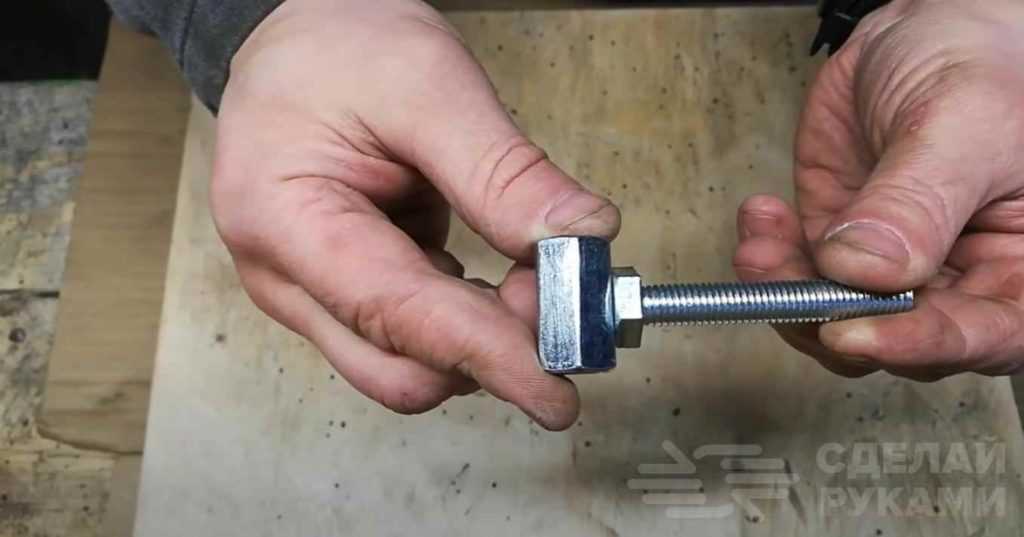 Далее необходимо изготовить еще один рычаг из профтрубы длиной 200 мм. С одной стороны профиля привариваем удлиненную гайку, с другой — болт. К длинному рычагу привариваем вторую удлиненную гайку.