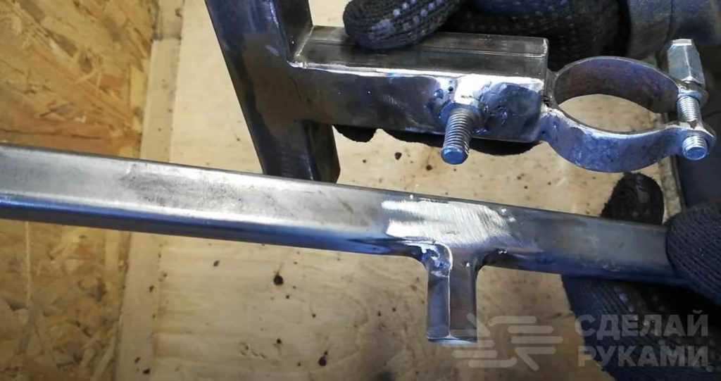 Отрезаем профильную трубу 25х25 мм (длиной 500 мм). Привариваем стойку к станине. Надеваем на нее подвижную часть. К держателю привариваем хомут.