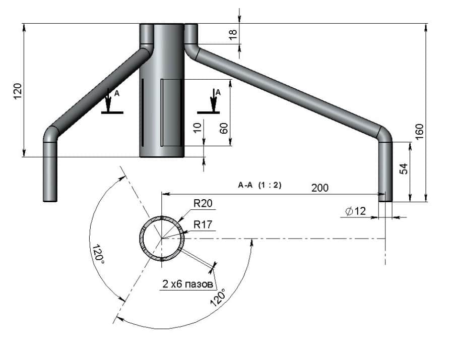 От металлической трубы отрежьте кусок необходимой длины. Из металлического прута вырежьте три одинаковые заготовки. На будущих ножках намечаются линии сгибов, как указано на эскизе. От верхней лини отметьте длину плеча. То же самое проделайте на нижней части.