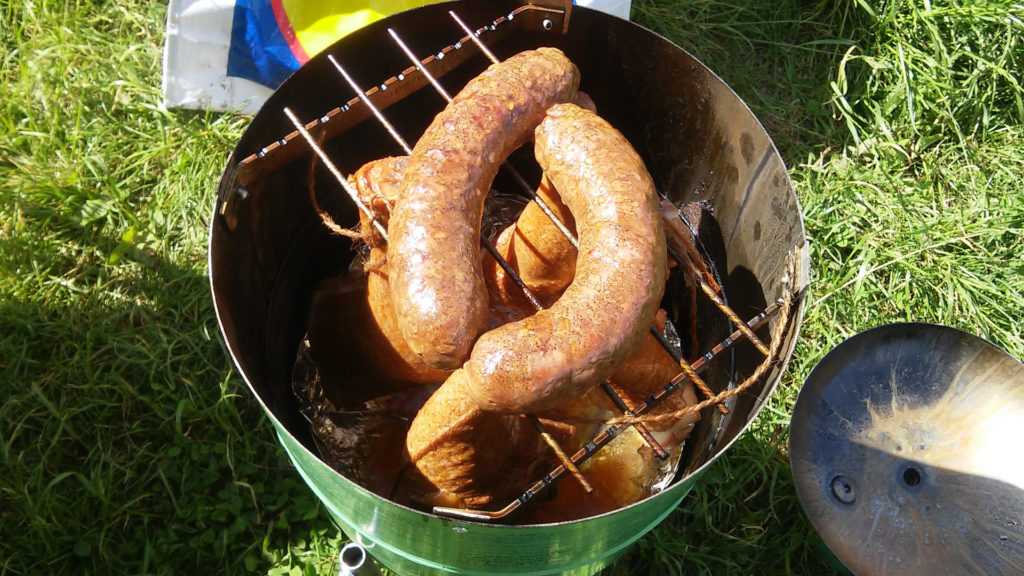 - Спустя 20-30 минут можно выключать коптильню, если готовится рыба. Для мяса потребуется около 40 минут, сало готовится – 1 час.