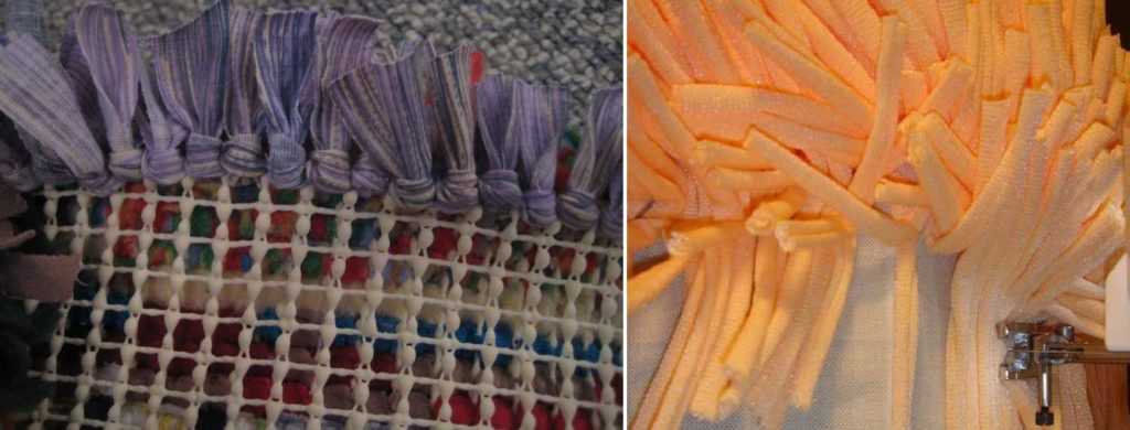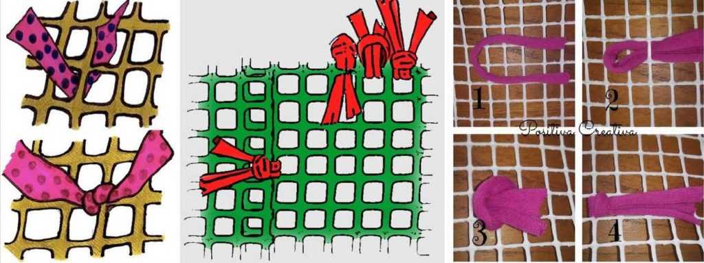 Идея до безобразия проста: к сетчатой основе привязывают нитки, полосочки ткани. Есть две техники привязывания — просто на узел, и сделав петельку. Они дают немного разный результат, но и та и другая техника хороши. Можете попробовать и выбрать.