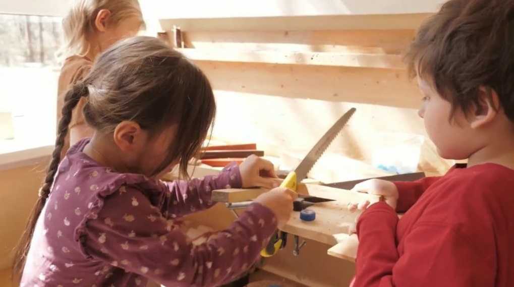 Возиться с инструментами нравится не только мальчикам. «Это будут часики», — говорит милая девочка в розовом платье и уверенно пилит деревяшку, периодически поправляя сползающую на плечо косу.