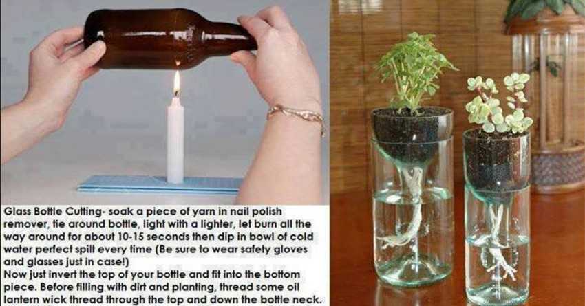 Из стеклянной бутылки можно соорудить самые креативные штучки для дополнения интерьера дома, если после разрезания украсить их всевозможными элементами. Берутся стеклянные изделия как из прозрачного материала, так и разноцветные, которые можно сочетать друг с другом.