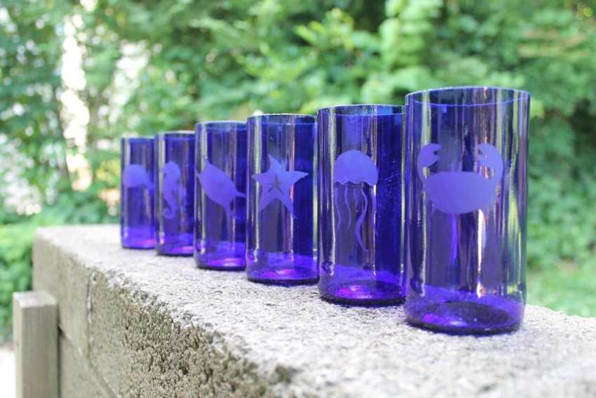 Можно сделать из пустой стеклянной тары стаканы и фужеры. Стаканы выполняются из нижней части бутылки, разрезанной поперек. Для фужеров нужна верхняя часть, перевернутая горлышком вниз и прочно приклеенная на устойчивую поверхность из пластика.