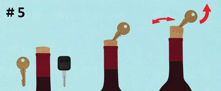 Вставьте ключ от машины в пробку под углом в 45 °. Надавите ладонью на ключ, чтобы он вошел большей частью в пробку и начните проворачивать ключ. Винные газы внутри бутылки помогут Вам вытянуть пробку. Это очень легкий, быстрый и безопасный способ! Кстати, для этого дела сойдет любой ключ с острым концом.