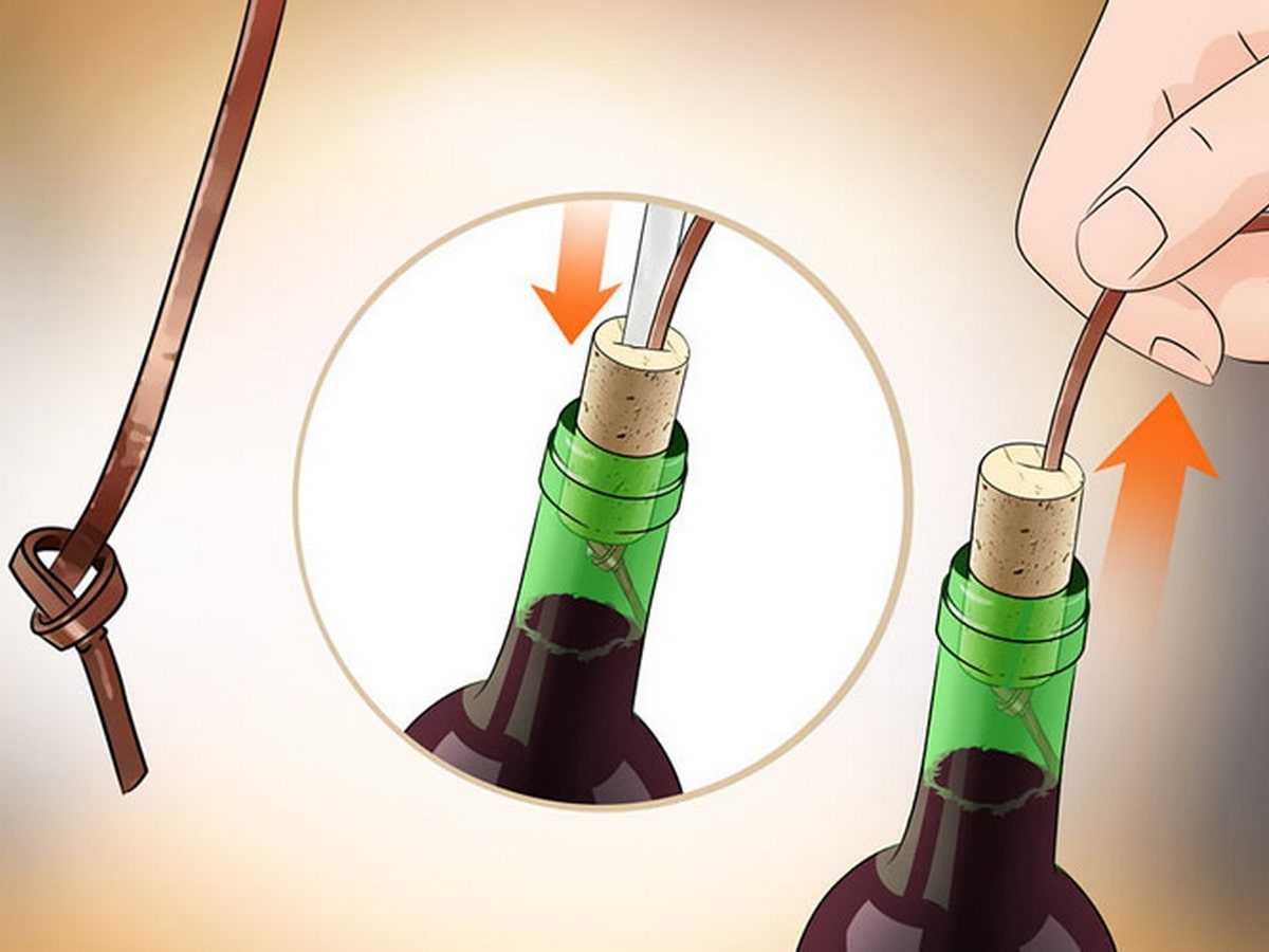 Другой эффективный способ того, как без штопора открыть бутылку вина, предполагает использование прочной нити (бечевки, шнурка, иного лоскута материи) и тонкого острого предмета – шила или спицы. Он заключается в вытягивании затычки из горлышка, для чего проделывают такие манипуляции: