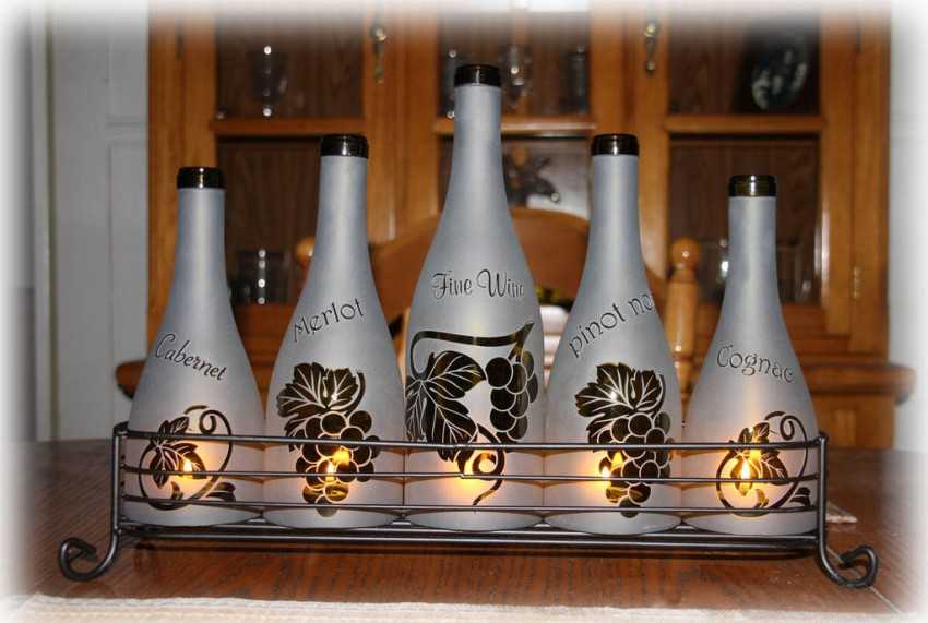 - Подсвечники. Изделия выполняются из выпуклой бутылки, в которой когда-то было вино. Перед изготовлением подсвечников, из тары вырезается отверстие в виде капельки. Внутрь вставляются свечи и поджигаются.