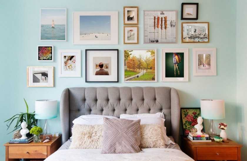 Если помещение маленькое, стоит воздержаться от большого количества рамок на стенах. Они будут создавать ощущение визуальной переполненности, сужать зрительное свободное пространство. Идеальным вариантом будет разместить 2-3 самых важных фотографии на стене, и еще 1-2 фотографии на полках.