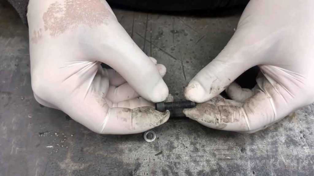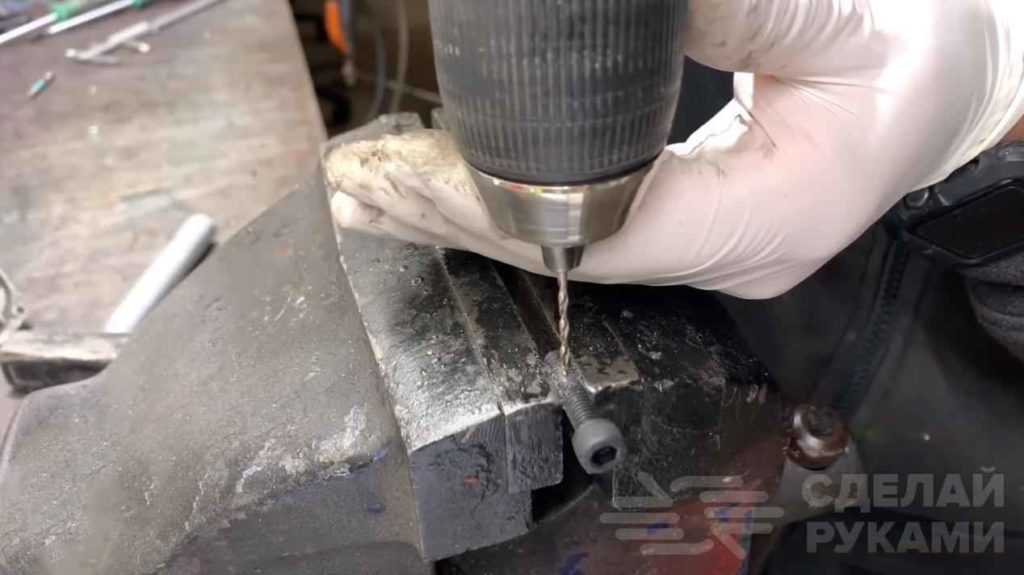На следующем этапе нам потребуется болт с головкой под шестигранник. С помощью напильника стачиваем часть резьбы на болте (делаем ровную площадку) и сверлим в нем отверстие.