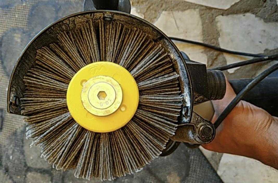 Щетка представляет собой закрепляемый на «болгарку» валик с щетиной из полимерных материалов. Ширина «валика» – 100мм. Диаметр – 120 мм.