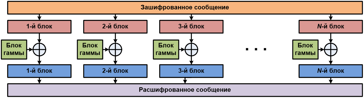 Для дешифровки закрытого сообщения необходимо произвести обратную операцию. То есть каждый блок зашифрованного сообщения ксорится с блоком гаммы, и на выходе мы имеем требуемое расшифрованное сообщение.