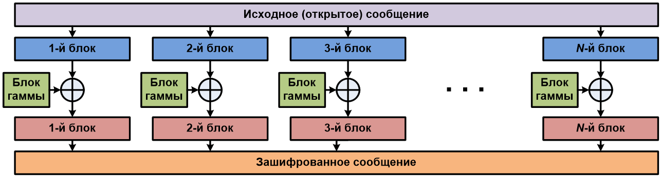 Гаммирование — это наложение (или снятие при расшифровке сообщений) на открытое (или зашифрованное) сообщение так называемой криптографической гаммы. Криптографическая гамма — это последовательность элементов данных, которая вырабатывается с помощью определенного алгоритма. Наложение (или снятие) гаммы на блок сообщения в рассматриваемом нами стандарте реализуется с помощью операции побитного сложения по модулю 2 (XOR). То есть при шифровании сообщений каждый блок открытого сообщения ксорится с блоком криптографической гаммы, длина которого должна соответствовать длине блоков открытого сообщения. При этом, если размер блока исходного текста меньше, чем размер блока гаммы, блок гаммы обрезается до размера блока исходного текста (выполняется процедура усечения гаммы).