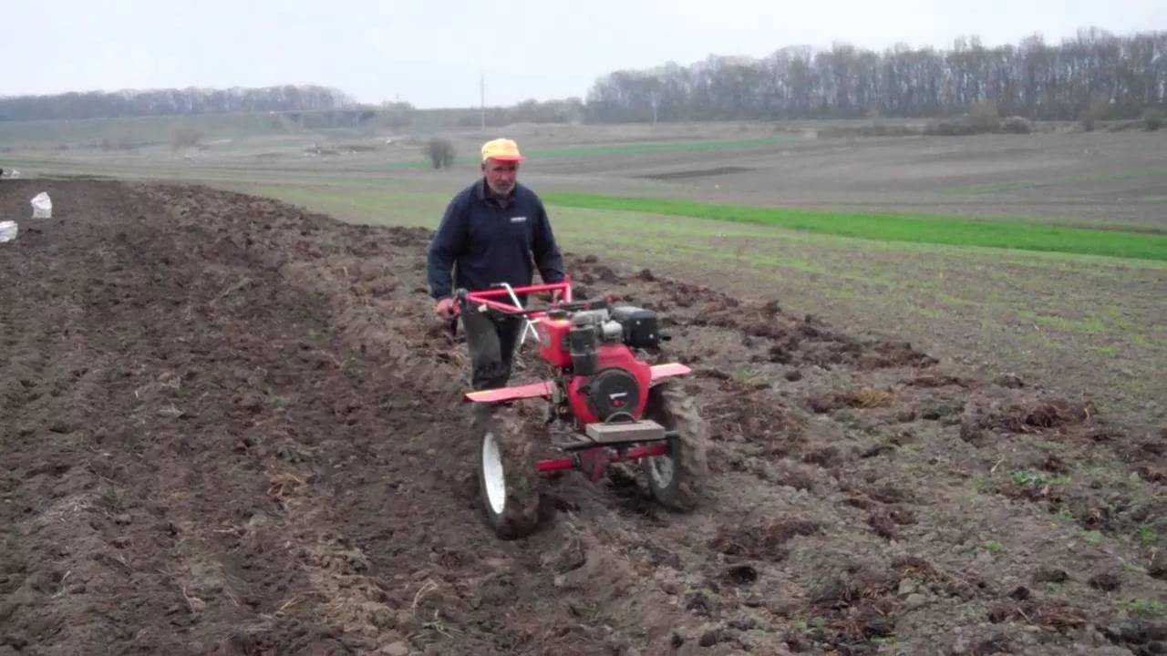 Сложность этого способа посадки в том, что положение однокорпусного плуга нелегко отрегулировать. Мотоблок все время идет под уклоном, т. к. одно его колесо находится на мягком вспаханном грунте, а второе — на целине.