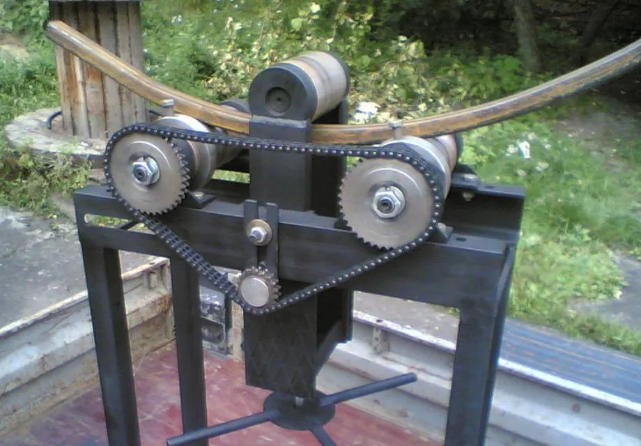 Полоса помещается между роликов и прижимается с помощью винтового механизма. При вращении приводного ролика полоса начинает двигаться между ним и опорными и загибаться в сторону привода. После полного прохода полосы получается практически идеальное кольцо. Если сделать рукоятку телескопической, чтобы можно были сделать длиннее плечо, то можно выполнять гибку на кольцо полосы практически любой толщины без особых физических усилий.