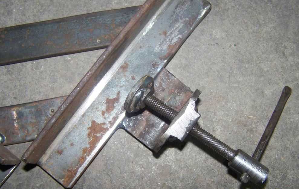 На каждую сторону крепим при помощи сварки червячную конструкцию. Это такой же уголок с наваренной упорной гайкой или утолщением, в котором нарезана резьба в соответствии со шпилькой-воротком. Ширина рабочего зазора подбирается под потенциальные заготовки.