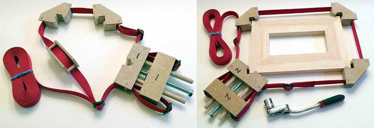 Ленточная струбцина оснащена ленточным элементом, позволяющим зафиксировать заготовку по периметру