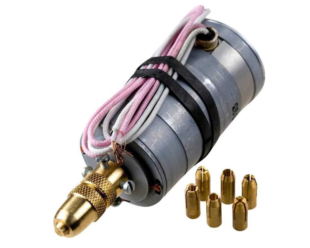 Чтобы иметь возможность использовать насадку от старой бормашины для выполнения мелких работ с изделиями из металла, пластика, древесины и кости, необходимо изготовить приспособление, при помощи которого такая насадка будет приводиться в действие от небольшого электромотора требуемой мощности. В качестве приводного электродвигателя для самодельной бормашины можно использовать маленький, но оборотистый и мощный моторчик от обычного фена или старого видеомагнитофона.
