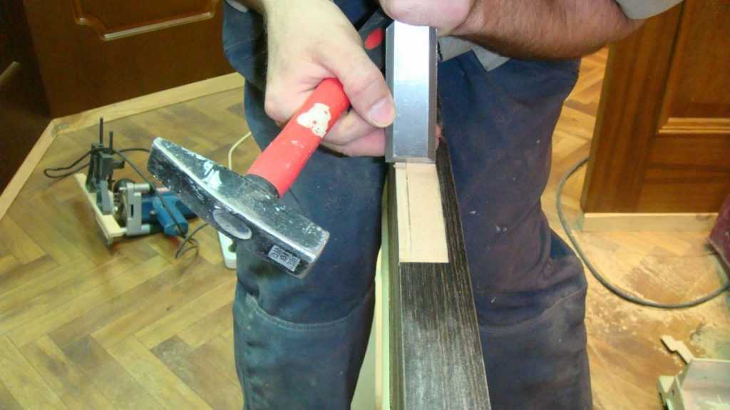 - Теперь необходимо, используя стамеску, молоток, долото сделать углубление по обведенному контуру на размер толщины планки. Выполняйте этот этап не спеша, аккуратно. Если снять больше — петля перекосится, работа двери будет нарушена. Поэтому не торопитесь.