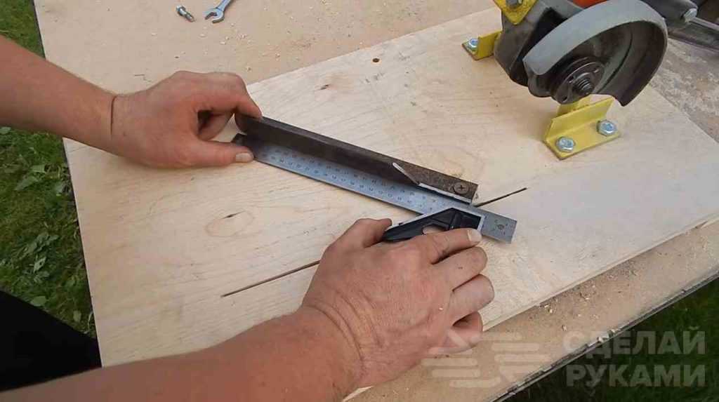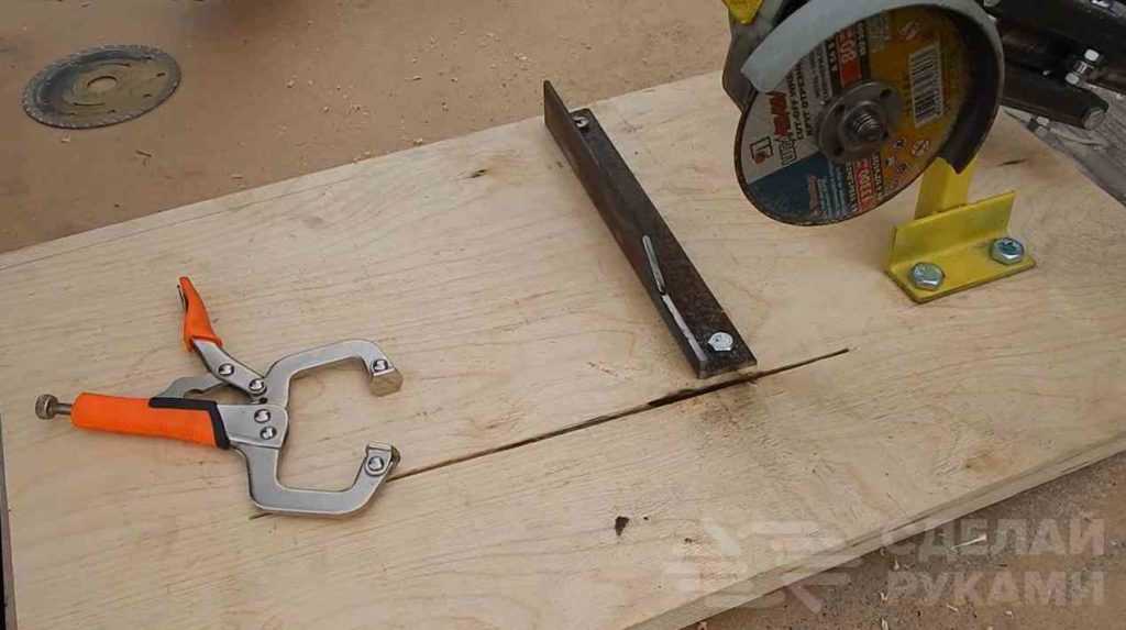 На последнем этапе прикручиваем к основанию упорную планку для заготовок, сделанную из уголка. Саму планку можно выставить под углом 90 и 45 градусов.