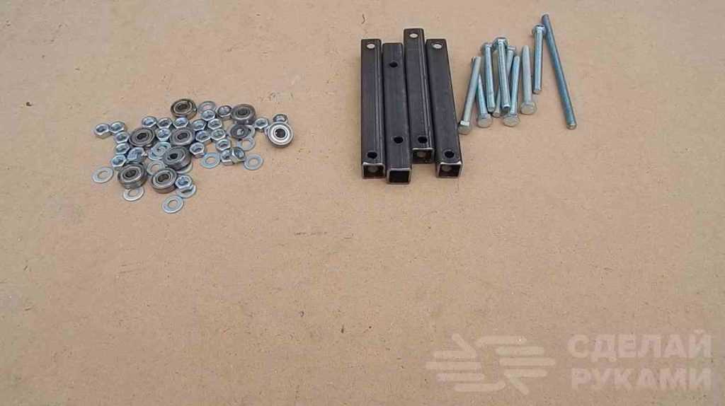 На следующем этапе потребуются куски профильной трубы с ранее просверленными отверстиями, подшипники, болты с гайками и шайбами, а также кусок шпильки.