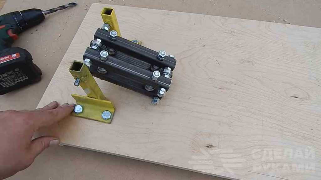 Из фанеры делаем основание. Прикручиваем к основанию детали из уголка и профиля, и фиксируем приспособление, изготовленное из отрезков профильной трубы 20*20 мм.