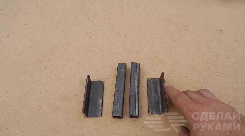 Далее потребуется еще два куска профильной трубы и два отрезка строительного уголка. Свариваем детали вместе. В уголках сверлим крепежные отверстия.