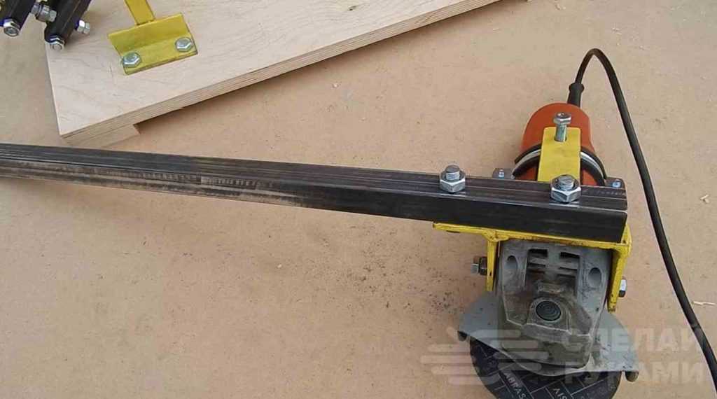 Устанавливаем на болгарку крепление и крепим к нему профильную трубу, которая затем вставляется в систему направляющих.