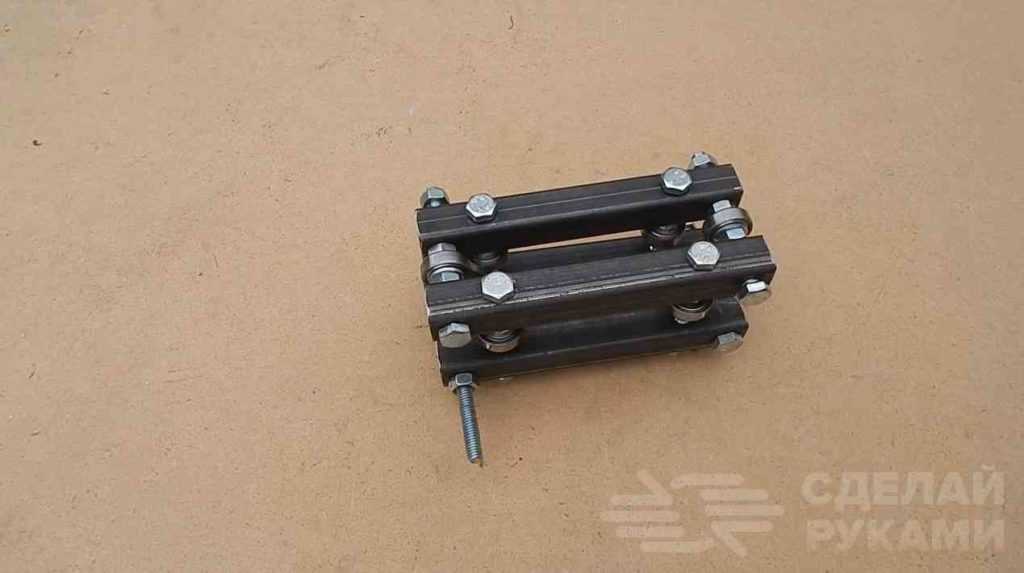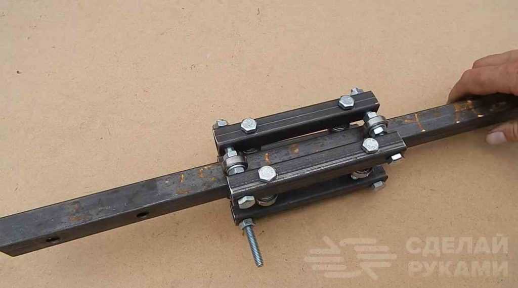 Из всех этих деталей автор собирает систему направляющих. В получившееся приспособление вставляется профильная труба. Затем выполняется регулировка — надо подкрутить гайки, чтобы избавиться от люфта.