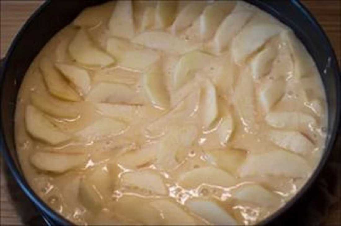 5 шаг: На дно формы выложите яблоки и влейте жидкое тесто (слабо встряхивайте форму, чтобы бисквит равномерно распределился между дольками начинки). И в духовку.