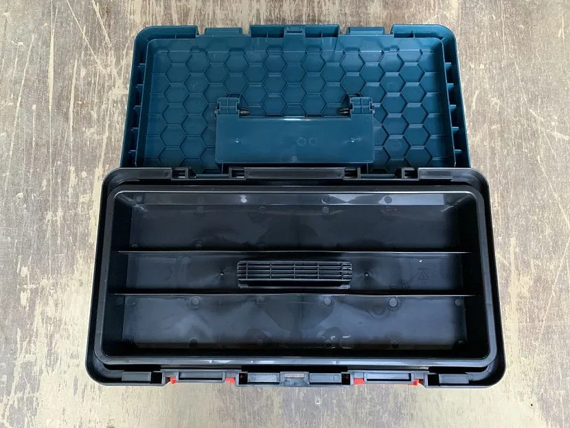 BOSCH Toolbox PRO 42.7×23.2×19.5 см. В отличие от предыдущих моделей, это устройство относится к категории бюджетных, поэтому оно отлично подходит для применения в домашних условиях. Универсальное изделие позволяет хранить любые материалы, но их сортировка должна быть выполнена очень тщательно, чтобы они не перемешивались между собой. Допустимая нагрузка для ящика – 20 кг.