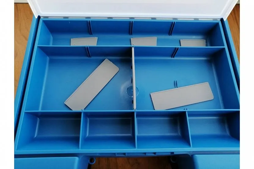 Верхние отсеки органайзера имеют покрышки из прозрачного пластика. Это обеспечивает обзор содержимого без открывания замка, что позволяет выполнить контроль взятых для работы расходников.