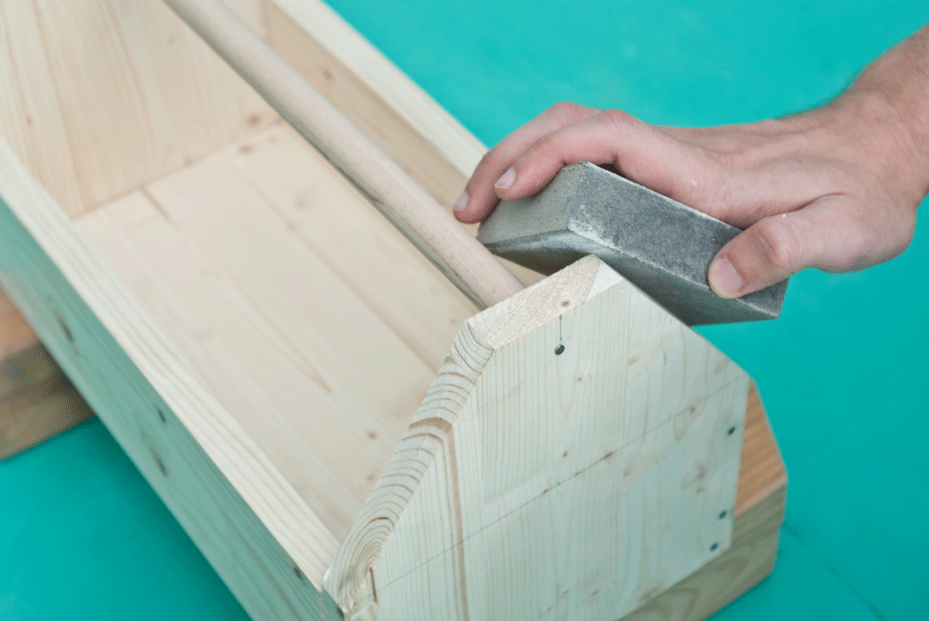 Ещё раз обрабатываем инструментальный бокс мелкой абразивной бумагой, чтобы удалить малейшие заусенцы. Покрыть конструкцию защитным составом и дать высохнуть. Если после такой обработки обнаружились поднятые волокна древесины, то необходимо ещё раз обработать ящик наждачкой и повторить отделку.