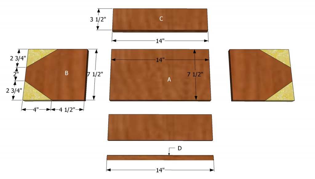 - По указанным в схеме размерам вырезают полку (D), и при помощи шурупов фиксируют ее на высоте 140 мм.