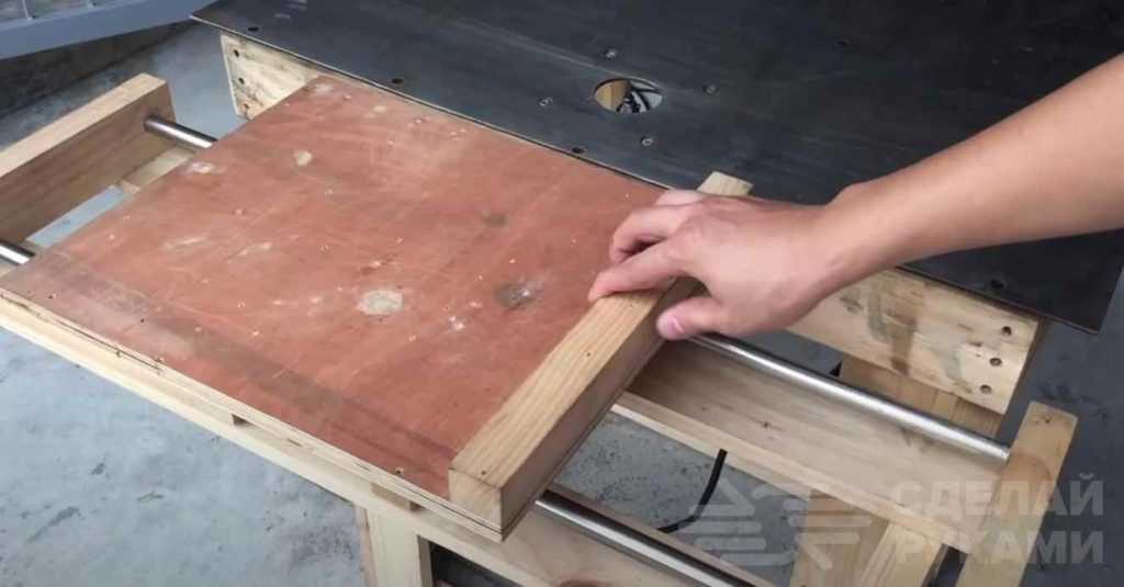 Две доски соединяются под основанием. На них размещается подвижная платформа, которая перемещается по двум направляющим. К границе участка нужно прикрутить стопор для заготовок.