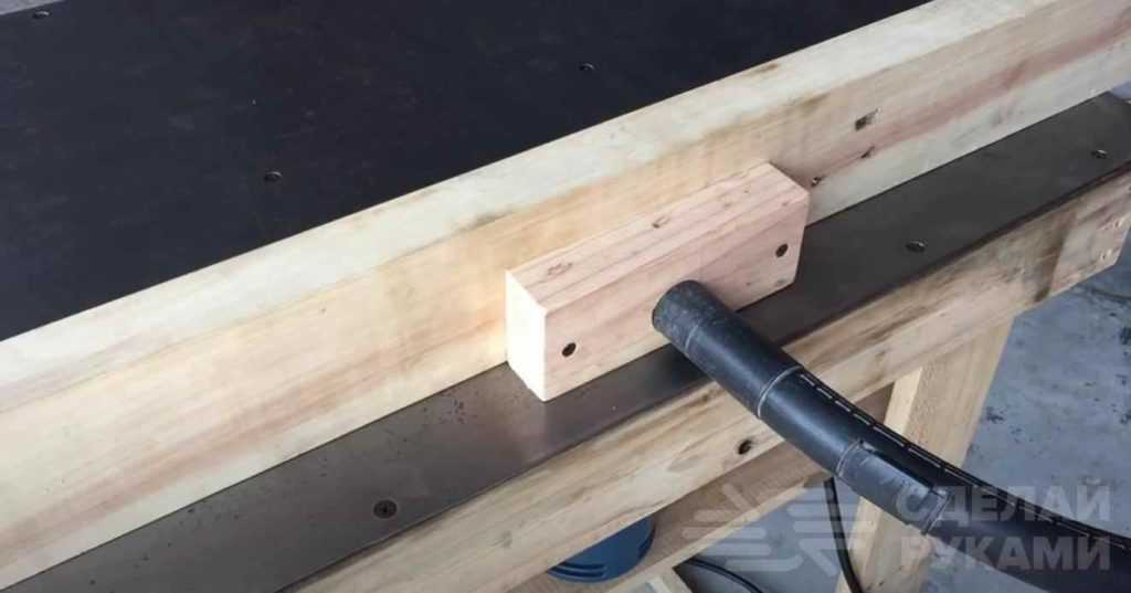 Важным моментом является возможность удаления пыли. С обратной стороны упора крепим дощечку с отверстием, в которое вставляем шланг от строительного пылесоса.