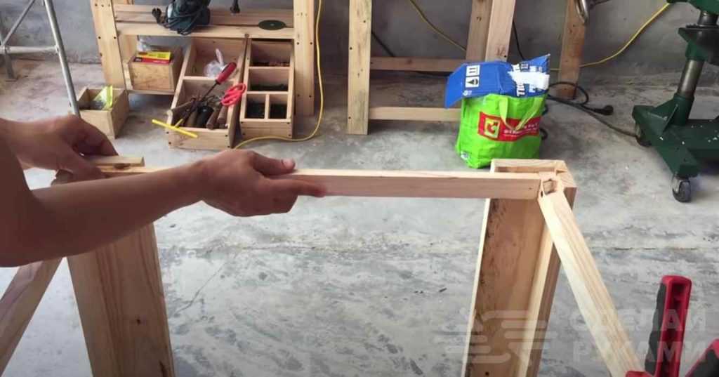 Для устойчивости и жесткости собранной конструкции на низ ножек кладем деревянные планки, делаем обвязку.