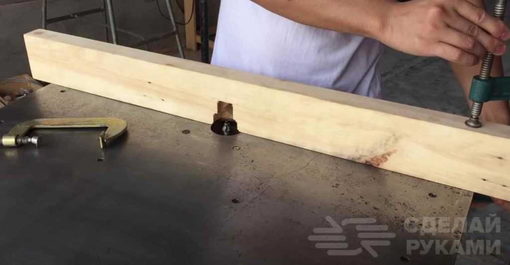 Отрежьте доску нужной длины. Вырежьте отверстие в центре для резака. Упор крепится к рабочей поверхности струбцинами.