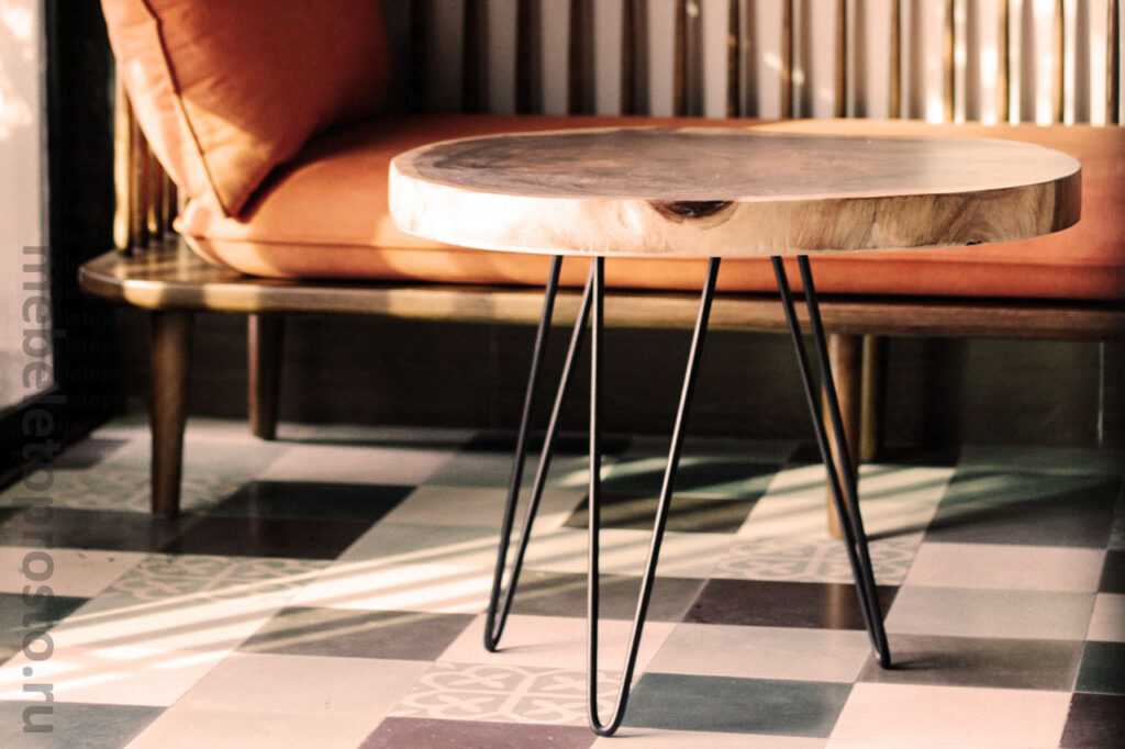 Еще один очень популярный вариант использования спилов – столешницы для журнальных столиков. В этом случае чаще всего выбираются небольшие поперечные спилы круглой или более сложной формы. Каркас может быть металлическим или также деревянным.