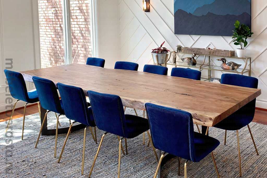 Для небольших столиков можно выбрать круглый поперечный спил. Но для больших семейных обеденных столов идеально подходят слэбы. При этом столешница может быть выполнена из цельного куска древесины. А может изготавливаться в виде комбинации дерева и акриловой смолы. Такие эффектные изделия получили название «стол-река». Края такой столешницы часто делают прямыми, чтобы визуально не перегружать изделие.