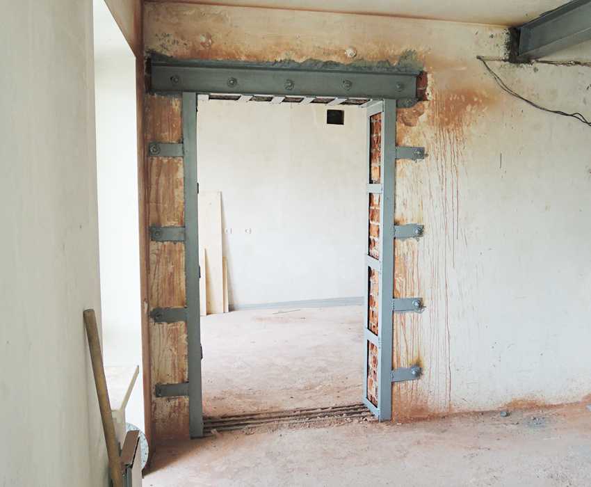 Самым распространенным решением, позволяющим уменьшить габариты проема на 5 см, является использование стальных уголков. Они выполняют функцию корректирующей рамки. Ее сборка осуществляется с помощью сварочной аппаратуры, после чего производится заделка конструкции цементным раствором.