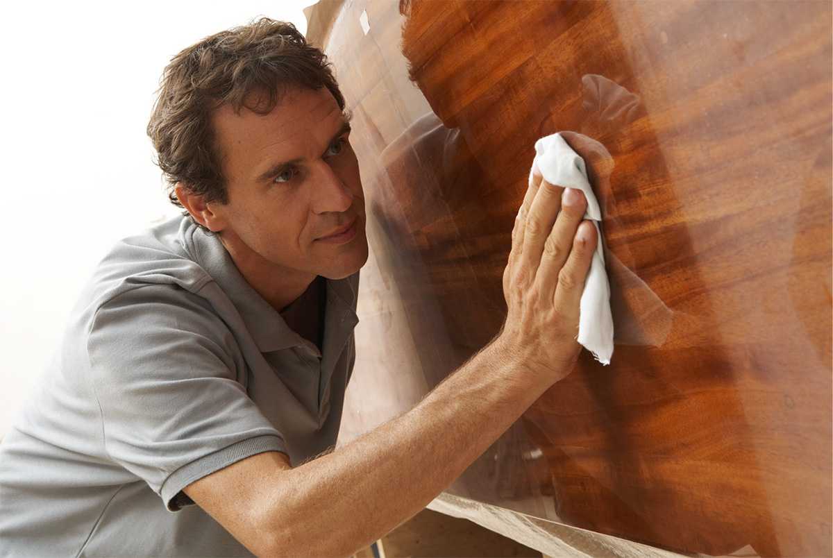 1. Предварительная подготовка. Перед тем как обновить полированную мебель, ее необходимо разобрать. Далее наносим на поверхность раствор для очистки, затем тщательно промываем тёплой водой. Эта процедура позволит размягчить старую полировку, лак потрескается и в некоторых местах отслоится. Его остатки нужно убрать с помощью скребка. Далее проводят шлифовку наждачной бумагой. Начать нужно с более крупной абразивности и завершить мелкой. Поверхность должна стать матовой и однородной. Далее пыль убираем щёткой или влажной тряпкой.