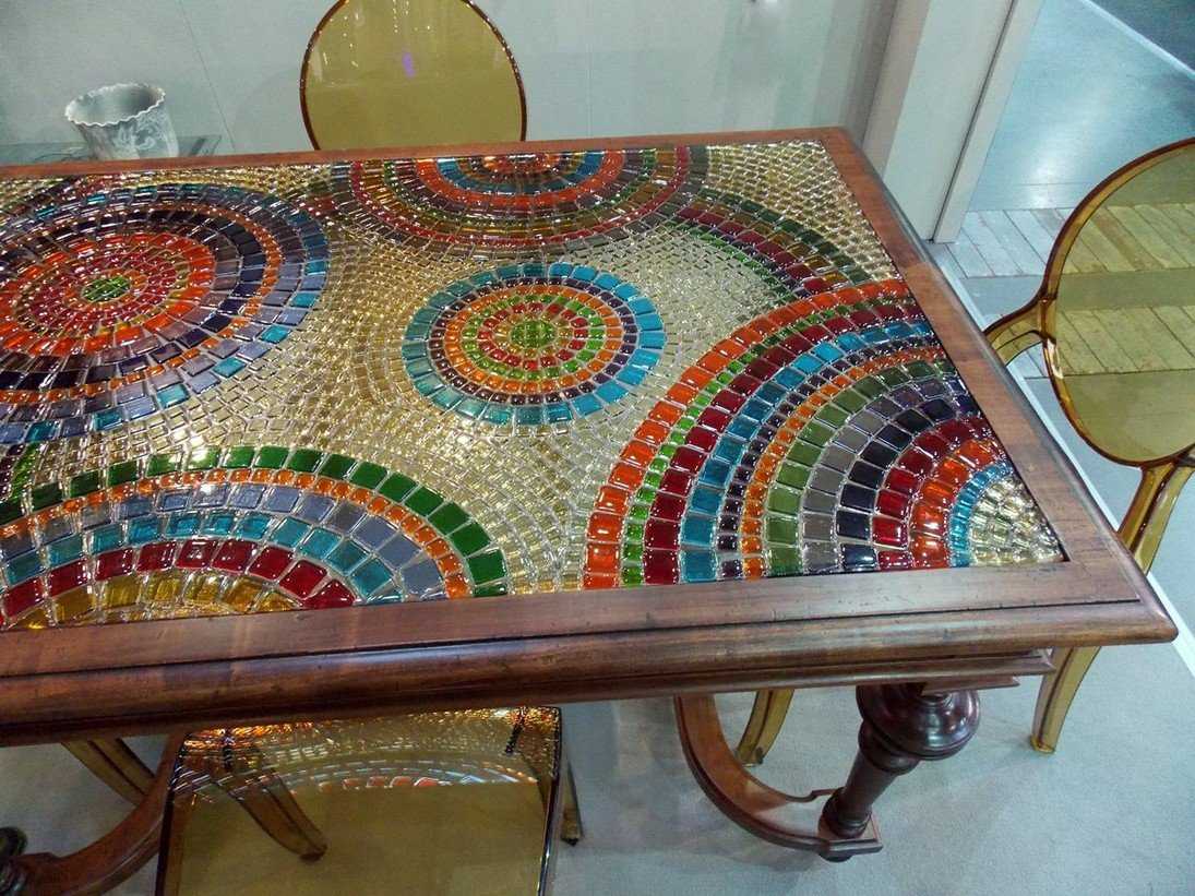 Садовые столы лучше всего украшать плиткой или мозаикой, особенно если они стоят на открытом воздухе. Если вам нужно украсить стол для детского творчества, можно проявить изобретательность и покрасить каждую ножку в свой цвет – получится яркий и веселый предмет мебели.