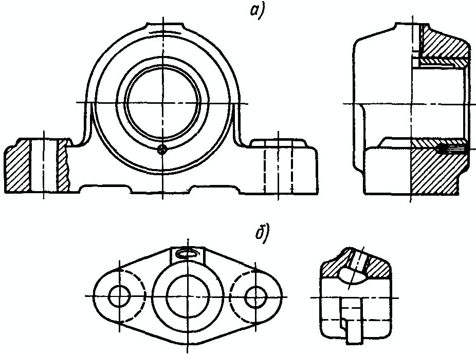 Нередко, например, для валов коленчатых возникает необходимость в разъемных подшипниках скольжения. Они позволяют значительно упростить сборку, а иногда являются единственным вариантом монтажа. Такая опора имеет разборный корпус. Основание и крышка корпуса стянуты гайками на шпильках. Вкладыш также состоит из двух половин. Подвод смазки производится через масленку, отверстие в крышке и каналы вкладыша.