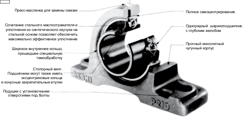 Обычно в таких узлах используется корпусной шарикоподшипник со сферической внешней и удлиненной внутренней обоймами. Он позволяет компенсировать перекосы валов.
