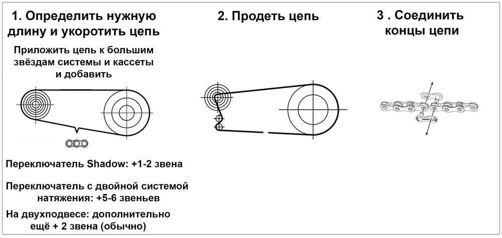 Некоторые предпочитают снять цепь, и проводить укорачивание в более удобном положении и месте — в таком случае перед соединением следует проверить, продета ли она в переключатели.